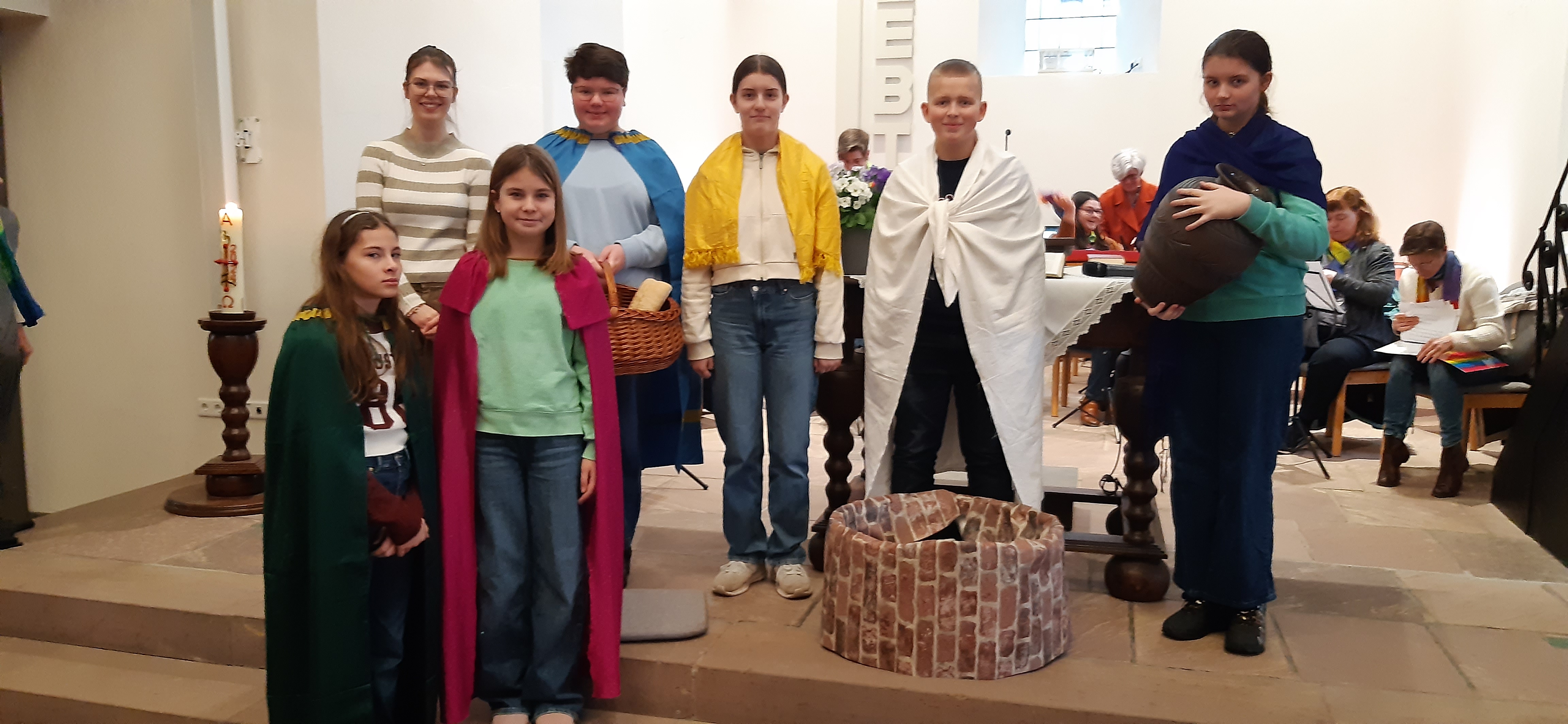 Folgende Personen wirkten mit: Als Spielerinnen: Ida Kreuzmann, Lilly Hand (fiel leider am Tag der Aufführung wegen Krankheit aus), Fiona Kowalski, Pia Meier und Janne Pleuger. Als Sprecherinnen: Corinna Becker, Rebecca Kreth, Anna Schnüll 2 (Katch.), Anna Schnüll 1 (Konfi/sprang spontan am Sonntagmorgen ein). CD legte auf: Joel Biaye, Glockenspiel spielte Felix Schulte- Overbeck und Gitarrenbegleitung übernahmen Leona Kreuzmann und Emily Ramm. Mila Brakemeier zog die Vorhänge des Puppentheaters auf und zu. Ich selbst begleitete das Ganze mit dem E- Piano.